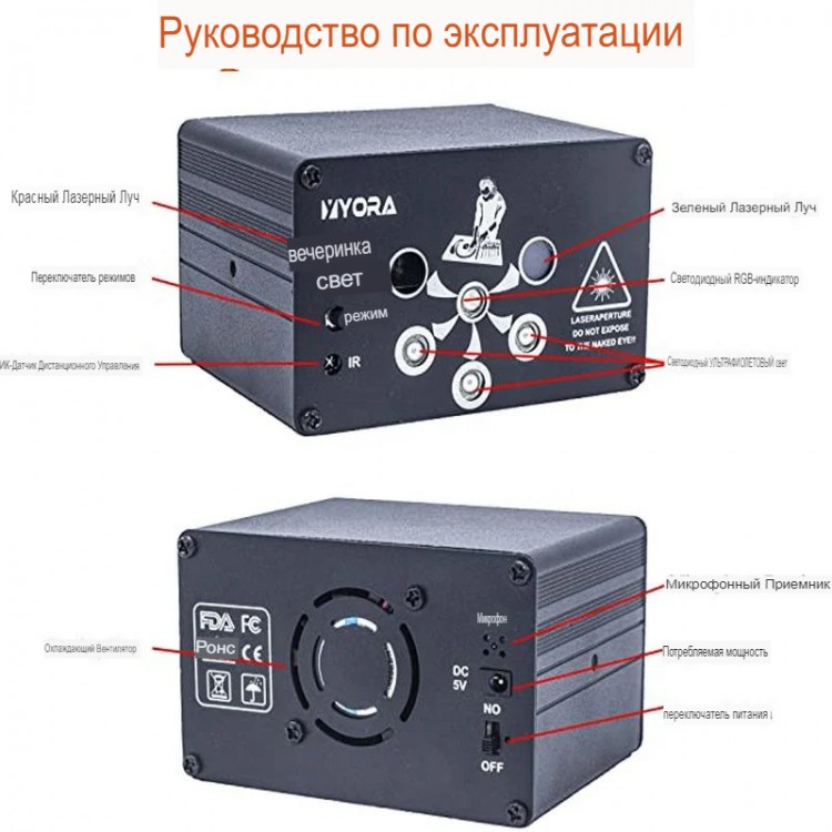 цветный светодиод, 3 УФ-лампы и красно-зеленый лазер. Это устройство не только генерирует стандартные световые эффекты, но также