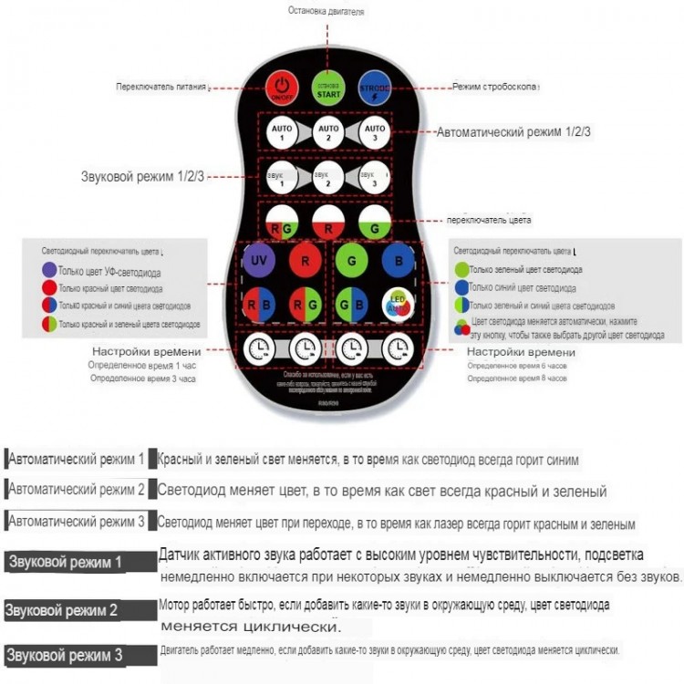 Диско-лазер на 6 отверстий оснащен интуитивно понятным пультом дистанционного управления, который позволяет полностью контролировать