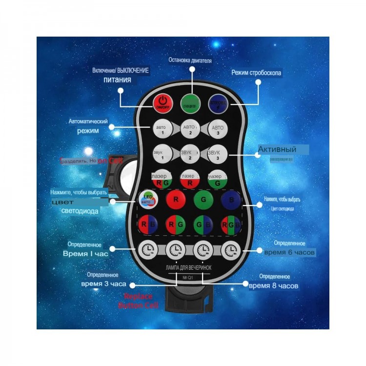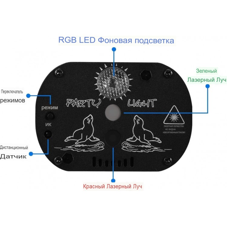 мощным 6-ваттным RGB-лазером с режимами активации звуком и дистанционного управления, способный создавать 60 комбинаций изображений и 6